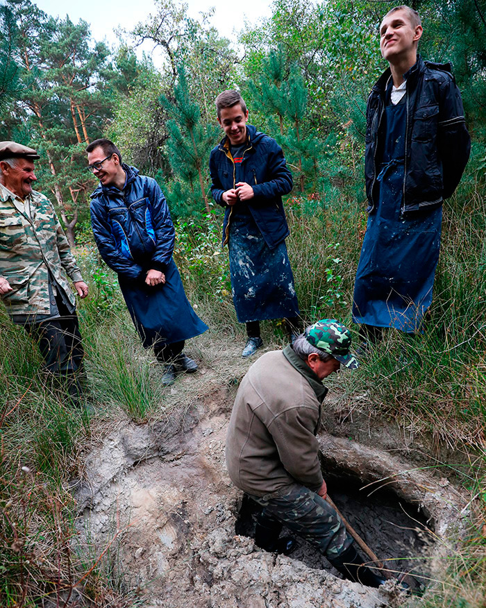 Сегодня чудо-глину для горшков мастера берут в трех-четырех километрах от деревни в хвойном лесу. С виду все несложно: с ведром, лопатой, подстилкой едут и копают яму в нужном месте. Говорят, раскопки до трех метров в глубину могут доходить. Но не только место отыскать надо. А еще и понять, та самая ли это глина. Мастера даже на зуб пробуют! Так умелец может сразу оценить, достаточно ли жирная порода, не много ли в ней песка.