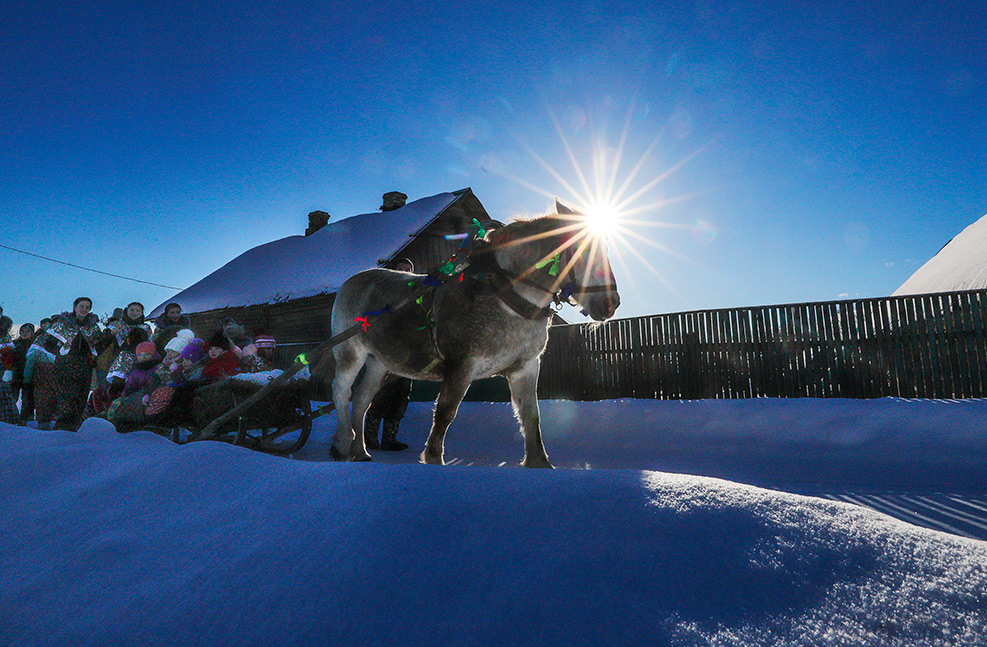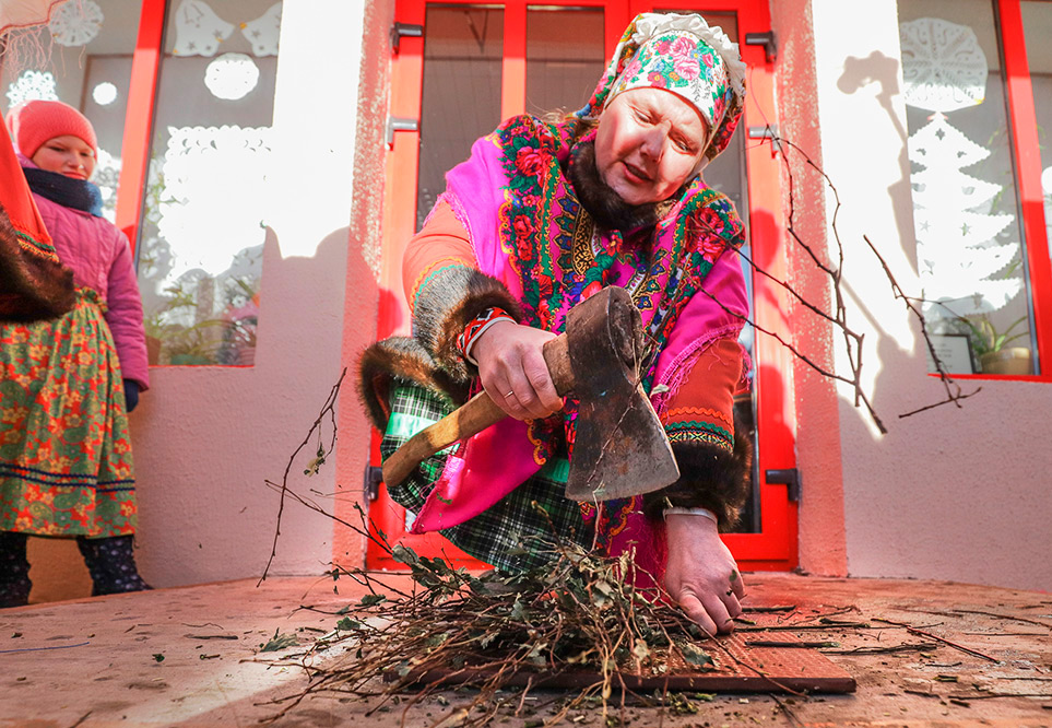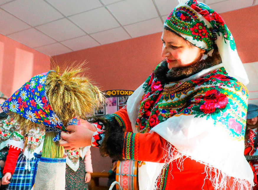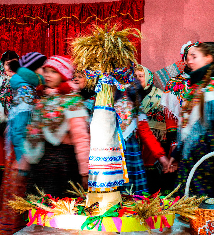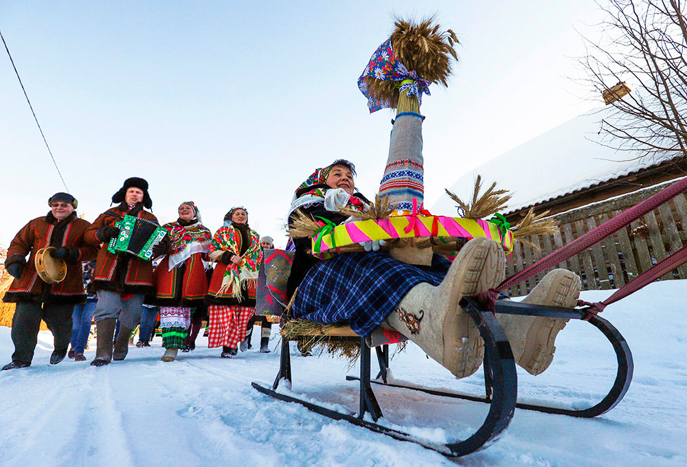 «Ой, нагрешила-нагрешила: и шила, и мыла, и стирала», - причитает Маргарита, топором перерубая веник на пороге СДК, а затем подбрасывает ветки в воздух. Точно так же делают еще несколько сельчанок. Теперь, когда грехи прощены, можно провожать Коляду. Сноп устанавливают на столике в СДК, а вокруг под народные песни водят хоровод ребята. Колоски обвязывают тканью - у Коляды появляются юбка и платок - а после торжественно выносят на крыльцо, к которому подъезжают сани.